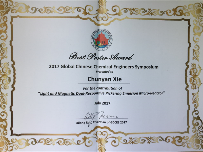 2017年7月18-21日,第九届全球华人化工学者研讨会在美丽的杭州西子湖畔举行。本次会议由浙江大学化学工程与生物工程学院与浙江工业大学化工学院共同承办。全球华人化工学者研讨会的宗旨是汇聚全球化工以及相关领域的专家学者,共同探讨国际化学工程教育与科学研究前沿问题、传播化工知识与技术、推动国际交流与合作、激励学科间的交叉融合和产学研协同创新、促进化学工程与技术领域的学术繁荣、并提高华人化工学者的全球影响力。该国际性学术会议是年度会议,采用国内国外轮流承办的模式。在本次会议中,我院孟涛老师课题组研究生谢春燕同学的学术海报荣获最佳海报奖。