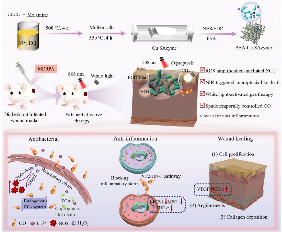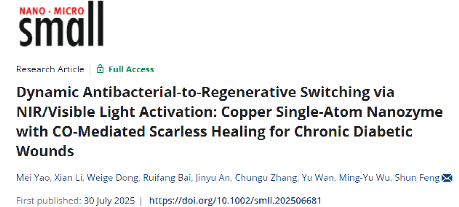 “生命分析技术与材料实验室”题为“Dynamic Antibacterial-to-Regenerative Switching via NIR/Visible Light Activation: Copper Single-Atom Nanozyme with CO-Mediated Scarless Healing for Chronic Diabetic Wounds”的研究成果。2023级博士研究生姚美为论文第一作者,封顺教授为通讯作者,91短视频