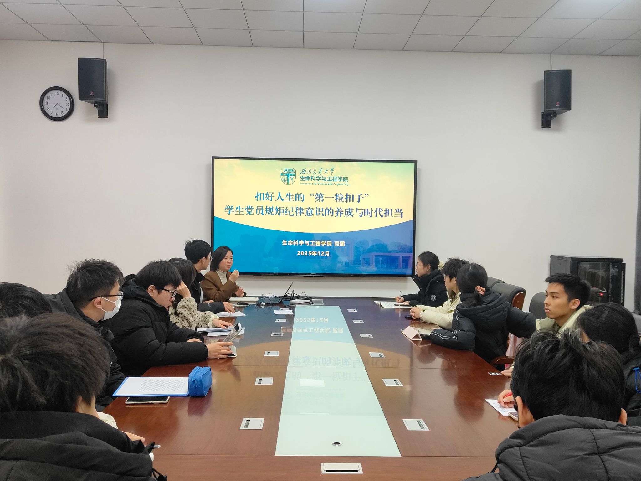 12月15日晚,本科生物工程第一党支部于犀浦校区X2314召开十二月支部党员大会,开展“严纪律 正学风 强引领 勇担当”主题党日活动。学院党委副书记高鹏及支部全体党员参加大会,会议由党支部书记潘星宇同志主持。