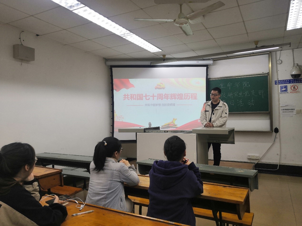2019级研究生党支部在4304a教室展开了“回顾共和国70周年辉煌历程”的党日活动,活动由党支部书记吴京川同志主持。