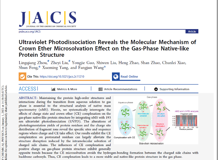 “生命分析技术与材料”封顺教授团队与中国科学院大连化学物理研究所王方军教授和杨学明院士团队合作的最新研究成果“Ultraviolet Photodissociation Reveals the Molecular Mechanism of Crown Ether Microsolvation Effect on the Gas-Phase Native-like Protein Structure” (DOI: 10.1021/jacs.2c11210)。论文共同一作为我校2020级硕士研究生周伶强和中科院大连化学物理研究所刘哲益副研究员,通讯作者为封顺教授和王方军研究员,91短视频